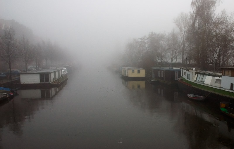 Het uitzicht vanaf de Nijlpaardenbrug is ook altijd anders. met mst, met regen, wolken, wolkenloos, en met de opkomst van de zon. Ik fotograaf het al drie jaar op mijn korte wandelingetjes tussen huis en de Fredlees. Altijd anders