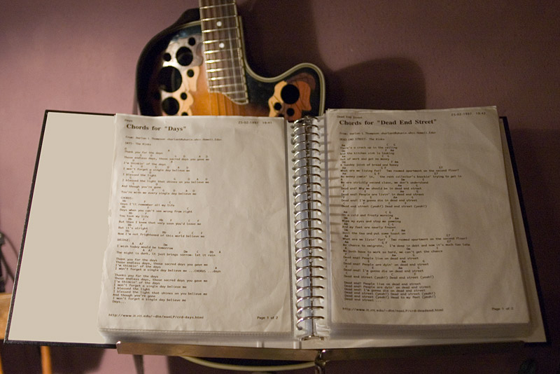 Het voornaamste is dat ik nu gewoon de map open kan doen en het liedje vinden wat ik wil spelen. Of ik kan er lekker in bladeren en denken: mmmm...daar heb ik zin in! Buffalo Ballet, van John Cale of Ft. Worth Blues van Earle of Hickory Wind van Gram Parsons of toch maar If I needed you van Townes Van Zandt?