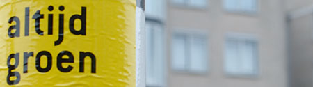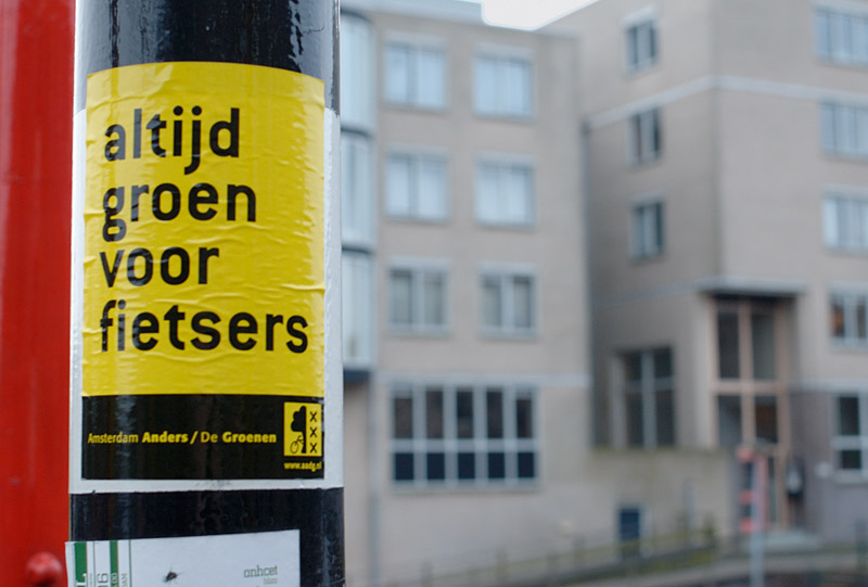 In ieder geval: toen ik deze sticker om een paal van de Nijlpaardenbrug zag zitten wist ik het: dit wil ik! Hoe Amsterdam Anders / De Groenen dit voor elkaar denkt te krijgen: geen idee, maar ik ben voor! Ik stel me ook voor dat je net als trams en bussen de mogelijkheid krijgt om als fietser de stoplichten te beïnvloeden, met een of ander apparaatje wat AA / De Groenen aan fietsers beschikbaar stelt. Je komt aanfietsen, drukt op een knopje en hop! het stoplicht springt op groen! Hoe dat dan precies bij een kruispunt zal gaan waar van vier kanten tegelijk fietsers komen aanfietsen: geen idee. Maar daar zullen ze bij AA/De Groenen toch wel over nagedacht hebben? Of bedoelen ze iets heel anders?