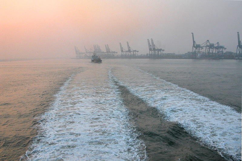 Ik vond het leuk om met deze boot te gaan, vooral op het achterdek met de spuitende straalmotoren, met de witte stromen. De foto boven maakte ik toen we uit Harwich weggingen, met prachtig licht, een beetje mistig, met een rode zonsondergang. Daarna gingen we lekker eten en drinken. Zoveel als we wilden. Trallalaa....