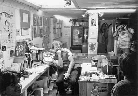 Op zoek naar foto’s in de oude doos, kwam ik bij een foto van Kees Kousemaker, in de eerste Lambiek, nog in het souterrain. Ik kan hem niet precies dateren, halverwege de jaren zeventig gok ik. Misschien herkent iemand de omslag van de stapel strips die op de toonbank ligt? Dan valt misschien te bepalen wanneer het ongeveer was.
