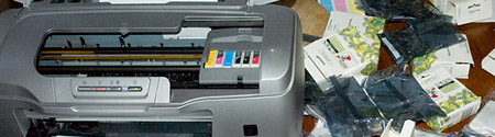 Eerder schreef ik over de verstopte spuitkanaatjes van mijn geliefde Epson R800. Vandaag moest ik hem helaas definitief dood verklaren. Ik heb hem geprobeerd weer tot leven te wekken door zijn hardnekkige verstopping met oplosmiddelen door te blazen, echter zonder succes. De spuitkanaaltjes voor de blauwe inkt blijven verstopt. Voor 51,78 Engelse Ponden weggeblazen...