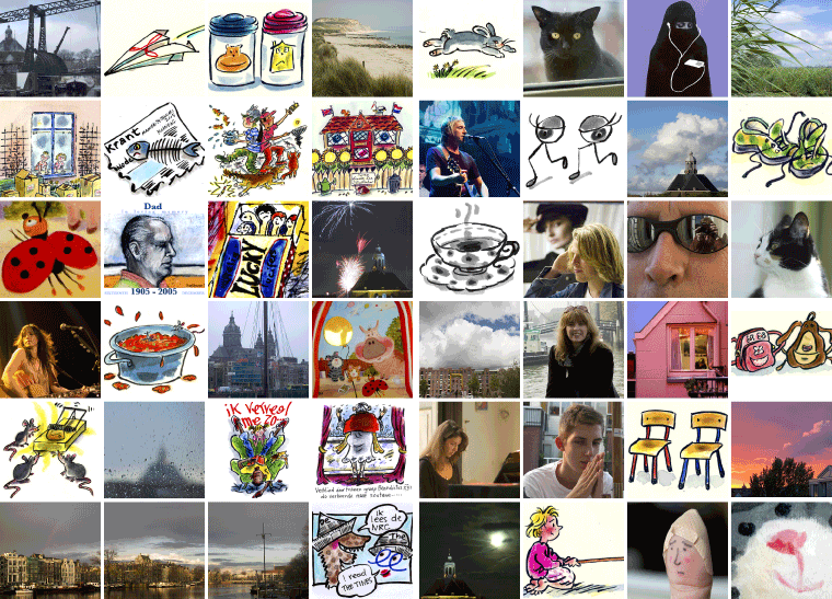 Het maken van de kerst/nieuwjaarskaart van de Fredlee’s liep dit jaar een beetje uit de hand. Dat gebeurt elk jaar, maar deze keer was het erger dan anders. We printen die kaarten zelf, vorig jaar op de dit jaar overleden Epson R800, dit jaar waren we aangewezen op de ouwe trouwe Epson Stylus Photo 1270c, die ook mooi print, maar een stuk langzamer dan de R800. De voorkant kaart bestond dit jaar uit allemaal vakjes gevuld met eigen werk van Mrs. en Mr. Fredlee. Tijdens het printen, dat per kaart zo’n 7 minuten duurde vroeg Mrs. Fredlee of we voor haar familie in Engeland een andere variant konden maken. Natuurlijk konden we dat en van het een kwam het ander. Er werden steeds meer vakjes anders, gepersonaliseerd als het ware. Voor Herbert en Anna: hun pianospelende dochters, voor Rob: Gambiet, voor Tommie: een ijsbeer (geen eigen werk, maar gejat), enzovoort... Oh ja, en toen bedacht ik dat we de binnenkant ook konden beprinten