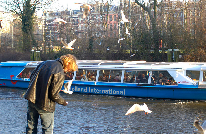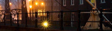Panorama van 2006. 's Morgens op weg, met zon, het was gisteren. Tijdens het fotograferen was er op de ene foto een fietser, op de andere niet, een duif op een van de palen bij de Magere Brug, en op de andere niet en een onzekere hand bij de Magere Brug zelf, waardoor de brug onscherp. Nu ja, een rommelig pano, maar aansluitend aan eerdere, die van de Amstel. Hij is gewoon mooi, qua sfeer, al is ie dan niet perfect. Vind ik dan.