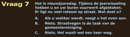 In de vragen bij het inburgeringsexamen was er ook een vraag wat je moest doen als je tijdens de jaarwisseling op straat flink wat vuurwerk had afgestoken. Het goede antwoord was dat je zelf even je straatje moest aanvegen en niet moest wachten op de gemeentereiniging. Ik had het fout - blijkbaar een beetje aso, maar ik steek geen vuurwerk af, dus weet ik veel - maar een groot deel van de Amsterdammers die vuurwerk hebben afgestoken hebben deze vraag ook niet goed. De hele stad ligt nog vol met rode resten van vuurwerk.