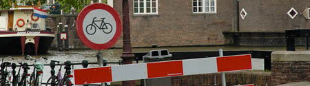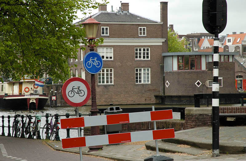 Op de Nieuwe Herengracht wordt een blok woningen gerenoveerd. De steigers staan op het trottoir en de parkeerplekken, zodat je als voetganger of op de middenweg moet lopen of op het fietspad dat langs de gracht loopt. Op dat fietspad wordt er altijd flink gebeld door de fietsers die er langs willen. En gelijk hebben ze: het is een fietspad. Maar nu is er door ambtenaren bedacht dat het fietspad tijdelijk, tijdens de verbouwing, een voetpad moet worden en dat de fietsers moeten omfietsen via de Valkenburgerstraat.