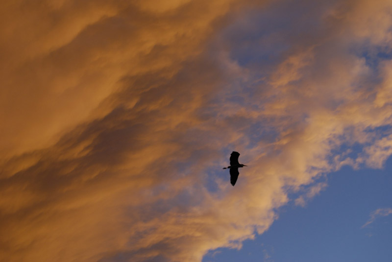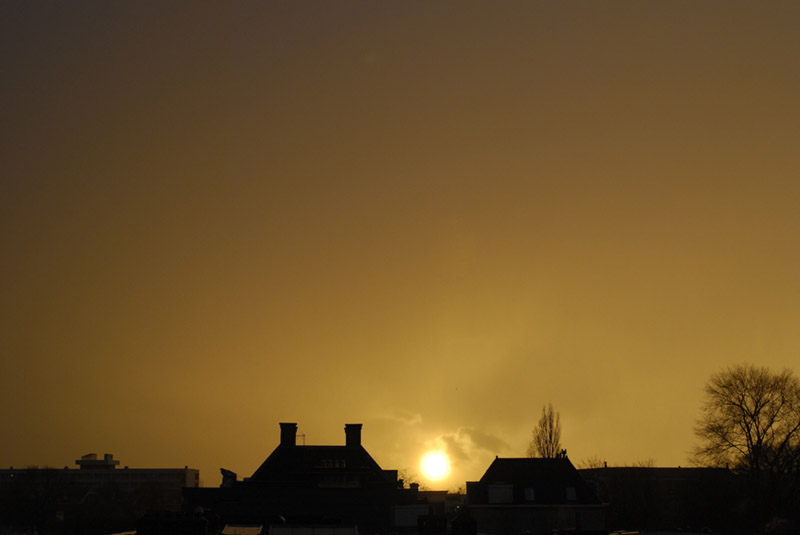 Het was een zich razendsnel afspelende wolkenparty. Eerst kwamen er donkere wolken aan, waaruit bliksemflitsen ontsproten. Het was heel donker, een waanzinnige donderklap, regen sloeg tegen de ramen. Plotseling was er licht, vaal geel licht, waar de zon doorheen brak als een wit gat. Het bleef nog wat na-regenen. Toen braken de wolken en kregen vreemde vormen en vreemde nep-roze kleuren. Er leek een trap naar de hemel te ontstaan, die daarna langzaam weer verdween...