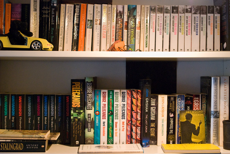Verder heel veel Engels gelezen en voornamelijk thrillers en detectives. Het jaar begon met de boeken George Pelecanos, waarvan ik er gedurende het jaar ook nog een of twee heb herlezen. Maar wat moest ik na Pelecanos? Gelukkig was er een nieuw boek van Michael Connelly met Inspector Harry Bosch: The Overlook. Daarna bracht De Thriller en Detective-gids van VN inspiratie. Mrs.Fredlee en ik pluisden hem uit en kwamen met een lijst schrijvers waarvan we vonden dat we maar eens wat moesten proberen. We kozen voor Ian Rankin en Peter Robinson en kochten daar in eerste instantie respectievelijk Let it bleed en In a dry season van. Daarna waren we niet meer te houden. Inmiddels heb ik alles van de Inspector Rebus-reeks van Rankin gelezen en ben ik op tweederde van de Inspector Banks-serie van Robinson.