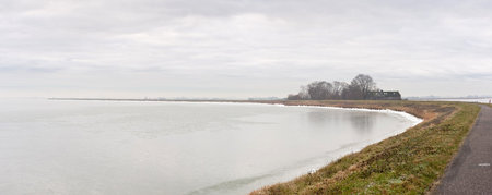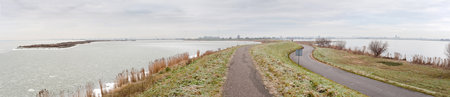 Op de kronkelige Uitdammerdijk naar Durgerdam, met links het IJmeer en rechts het Kinselmeer, met rechts in de verte de Stompe Toren van Ransdorp.