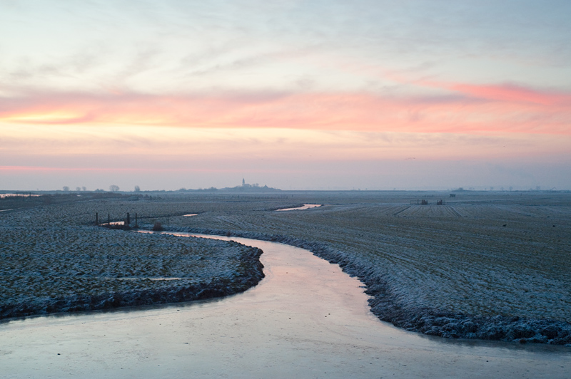 De zon was nog achter de horizon, maar de wolkenflarden waren al roze en het roze werd weerkaatst door het matglanzende ijs. Ik dacht niet aan deadlines die ik niet ging halen, aan pijn in een schouder of andere zaken. Ik keek alleen naar het roze en het blauw. Toen het lichter werd begonnen de schaatsers her en der op te duiken en was het ineens vreemd druk bij de Stompe Toren van Ransdorp.