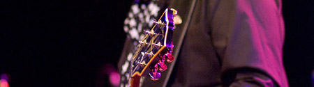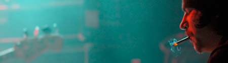 Bij het concert van Marc Ribot, vanmiddag in het Bimhuis, waren er geen gordijnen of iets dergelijks om het licht dat van buiten kwam op het toneel af te schermen. Ribot zat - wel door wat lampen verlicht - midden op het toneel, maar het licht van buiten zorgde ervoor dat hij een beetje een silhouet was tegen de achtergrond van het uitzicht uit het Bimhuis.