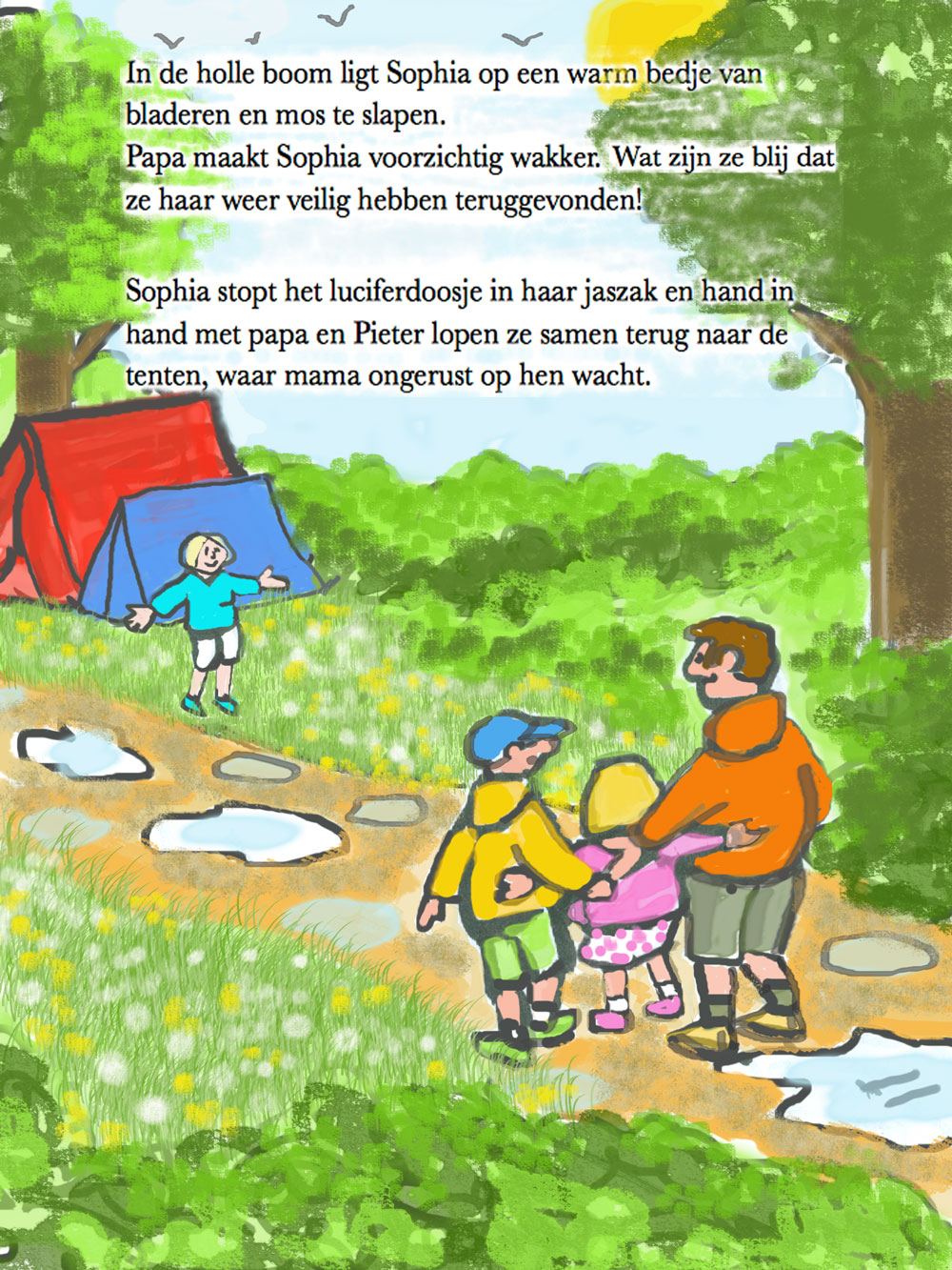 Sophia puts the matchbox inside her jacket pocket and hand in hand with her daddy and Peter they walk back to the tents, where mummy is anxiously waiting their return.